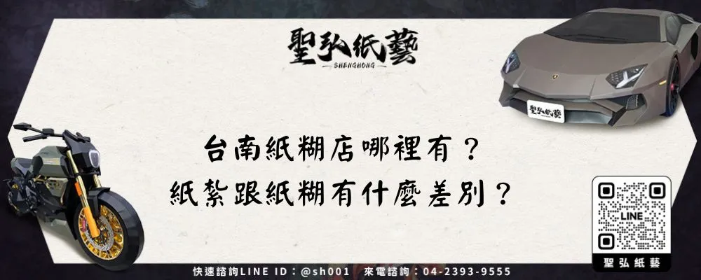 「聖弘紙藝」自行生產和銷售,憑借其豐富的經驗,提供了眾多獨特且多樣化的紙紮產品,包括客製化商品,只要有圖片就能客製化,他們以專業技術和友好的服務態度著稱。無論您位於台灣的哪一個城市,如台中、高雄或台北,都能享受到他們的服務,包括全島配送。即便您無法當天到店,也可以透過他們的官方LINE帳號「@sh001」與客服輕鬆溝通並下單,既便捷又省時。